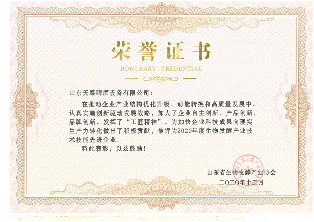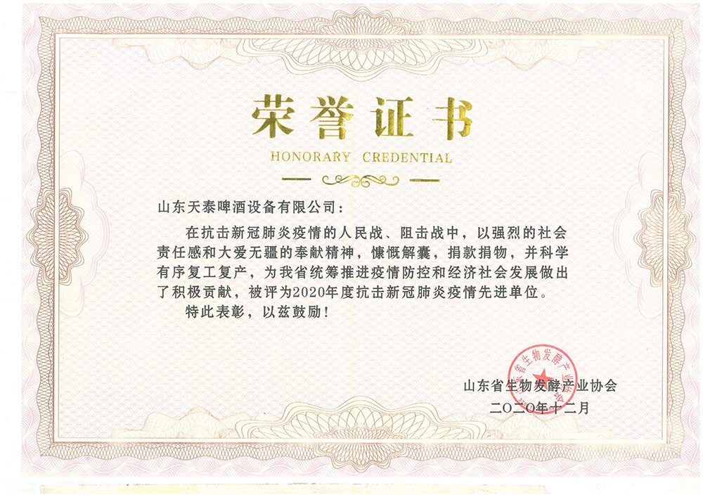 大會表彰了“山東省生物發(fā)酵產(chǎn)業(yè)協(xié)會抗擊新冠肺炎疫情先進單位”、“生物發(fā)酵產(chǎn)業(yè)技術技能先進企業(yè)和先進個人”。山東天泰啤酒設備有限公司被授予“抗擊新冠肺炎疫情先進單位”和“生物發(fā)酵產(chǎn)業(yè)技術技能先進企業(yè)”榮譽稱號。